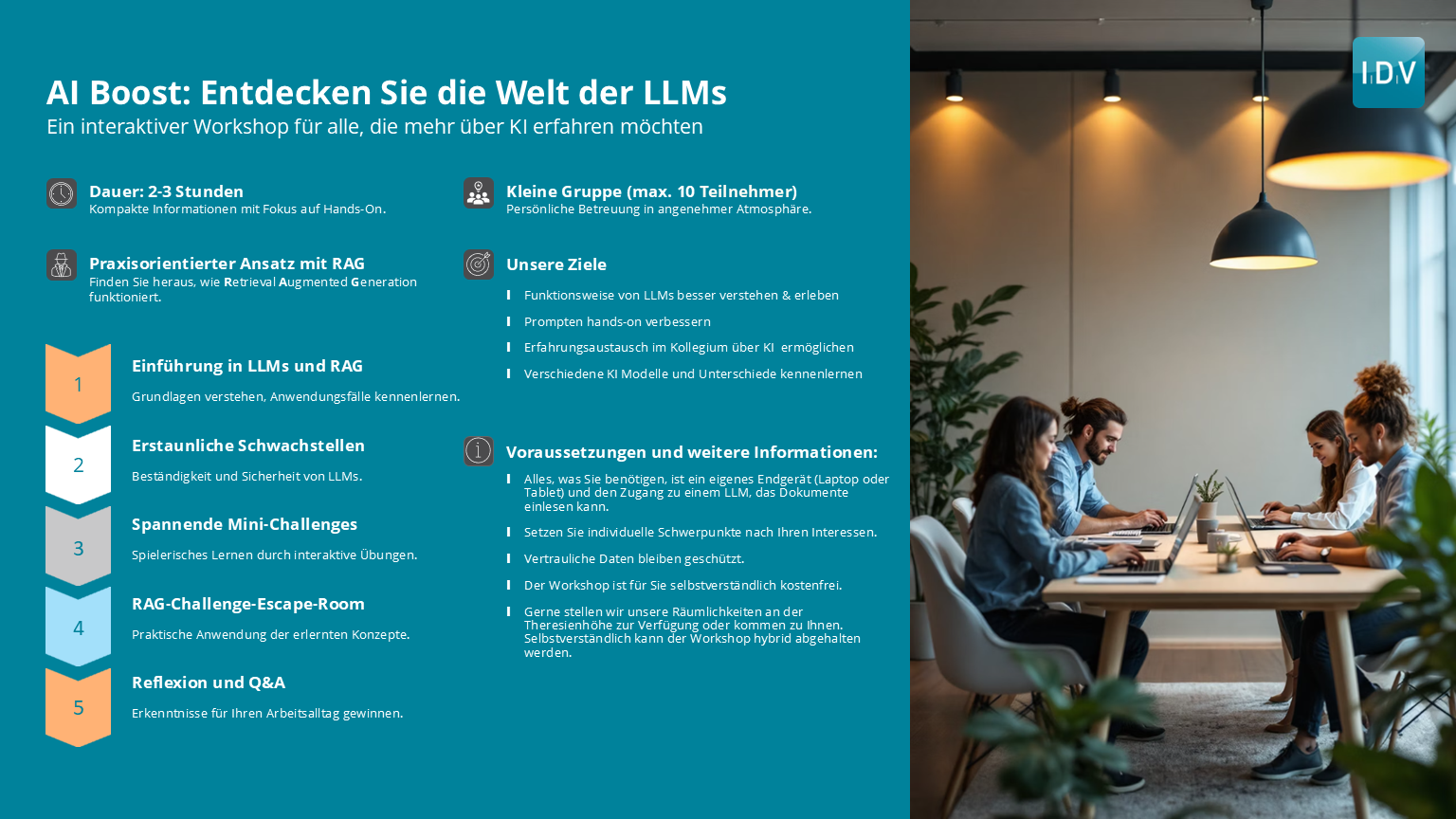 Antworten darauf gibt unser Workshop "AI Boost: Entdecken Sie die Welt der LLMs" - praxisnah, kompakt und mit Spaßfaktor. In nur 2-3 Stunden erleben Ihre Teams die Möglichkeiten und Grenzen von KI ganz konkret.